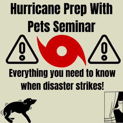 When disaster strikes, will you be ready to protect your pets? This seminar covers everything you need to know about preparing for hurricanes and other emergencies with pets in mind. From evacuation planning to emergency kits and local resources. You'll leave with practical tips, printable checklists, and peace of mind.